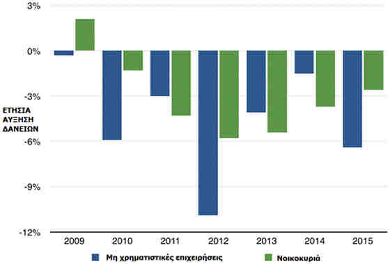 Οι ελληνικές τράπεζες ώθησαν τους πελάτες τους να καταφύγουν μαζικά στον δανεισμό για να χρηματοδοτήσουν την κατανάλωσή τους. Όπως δείχνει το γράφημα 4, οι πιστώσεις προς τα νοικοκυριά πενταπλασιάστηκαν μεταξύ 2001 και 2008. Όσο για τον δανεισμό των μη χρηματοπιστωτικών επιχειρήσεων, πολλαπλασιάστηκε επί 2,5. Αντίθετα, κατά την ίδια περίοδο, οι ελληνικές τράπεζες μείωσαν τις χορηγήσεις δανείων προς το δημόσιο.